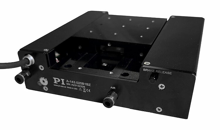 PIglide miniature linear air bearing stage; ironless 3-phase linear motor; 25 mm travel range; 40 N load capacity; 390 mm/s maximum velocity; absolute linear encoder, 1 nm sensor resolution, BiSS-C; electromagnetic holding brake; 0.5 m cable length