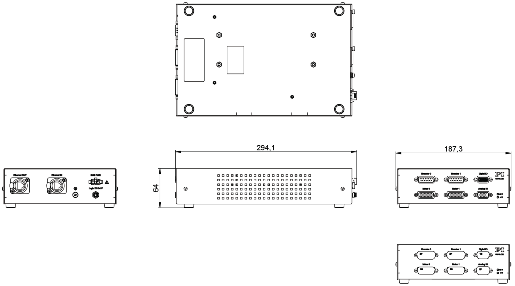 | Digital I/O lines | HD D-sub 15 (f):2 × outputs PNP 24 V source; also control the brake drivers at the motor connectorsDefault for inputs:2 × PNP 24 V source on HD D-sub 15 (f); in addition 2 × NPN 5 V sinking for reference switches on the motor connectorsOptional configuration for inputs:4 × PNP 24 V source on HD D-sub 15 (f) | ||