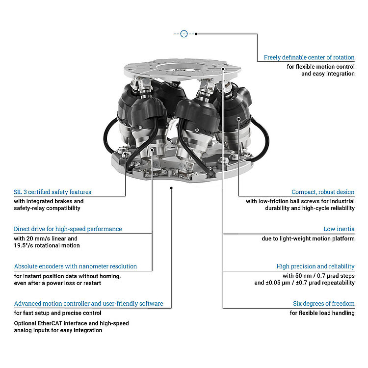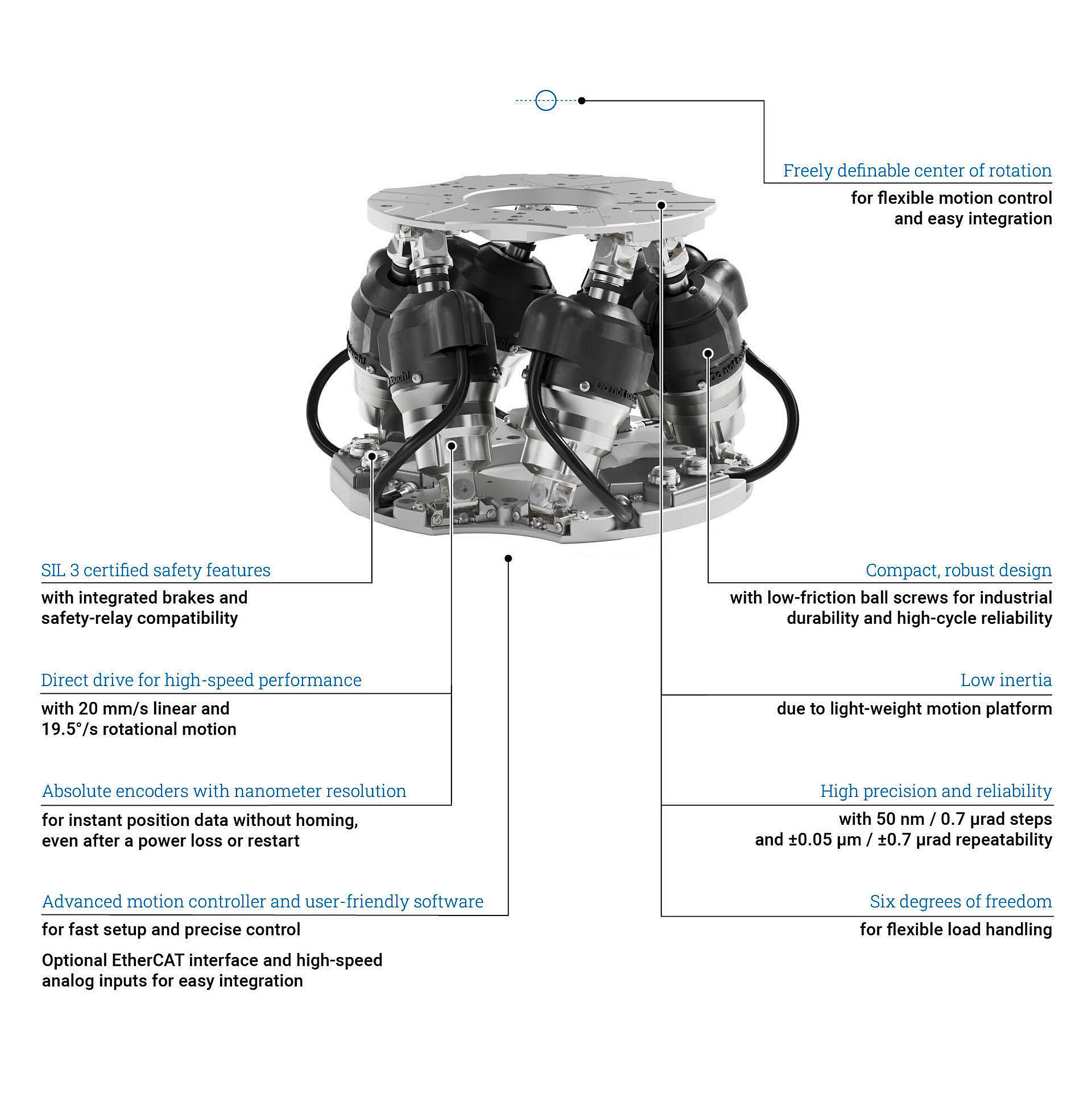 Hexapod for industrial precision applications; BLDC motor; 10 kg payload; 20 mm/s maximum velocity; absolute measuring encoder. Connecting cables are not included in the scope of delivery and must be ordered separately.