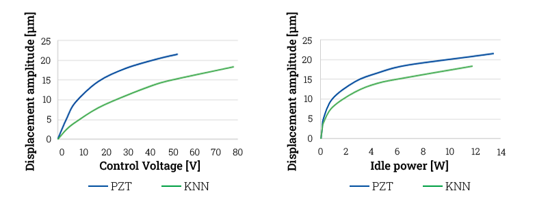 It should be noted that the higher loss factor with lead-free materials at the same displacement amplitude at the tip of the transducer leads to greater heat generation in the rings. In addition, greater self-heating occurs due to a higher power dissipation.
