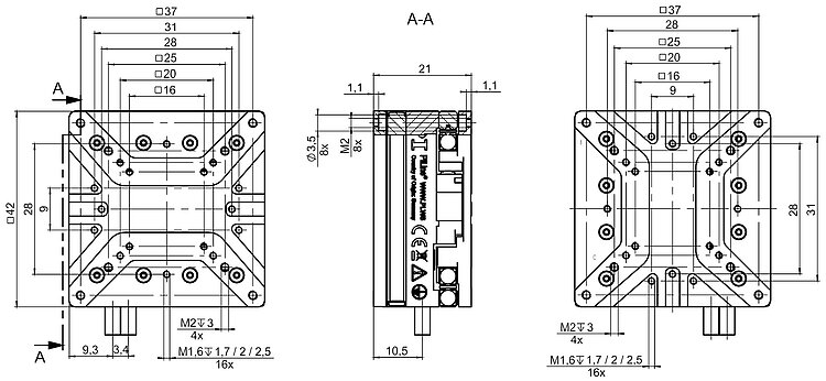 PILine® XY stage; PILine® piezo motor, performance class 1; 22 mm × 22 mm travel range (X × Y); 5 N load capacity; 200 mm/s × 200 mm/s maximum velocity; 2 N drive force; incremental linear encoder; 10 nm sensor resolution; 1.5 m cable length
